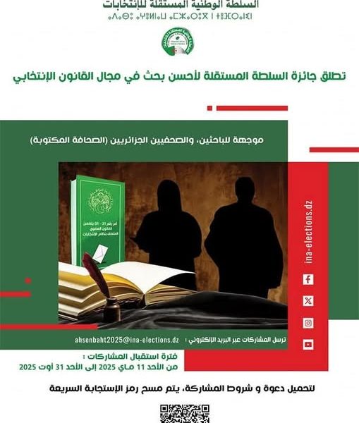 أعلنت السلطة الوطنية المستقلة للانتخابات، عن إطلاق جائزة السلطة المستقلة لأحسن بحث في مجال القانون الانتخابي الجزائري.
