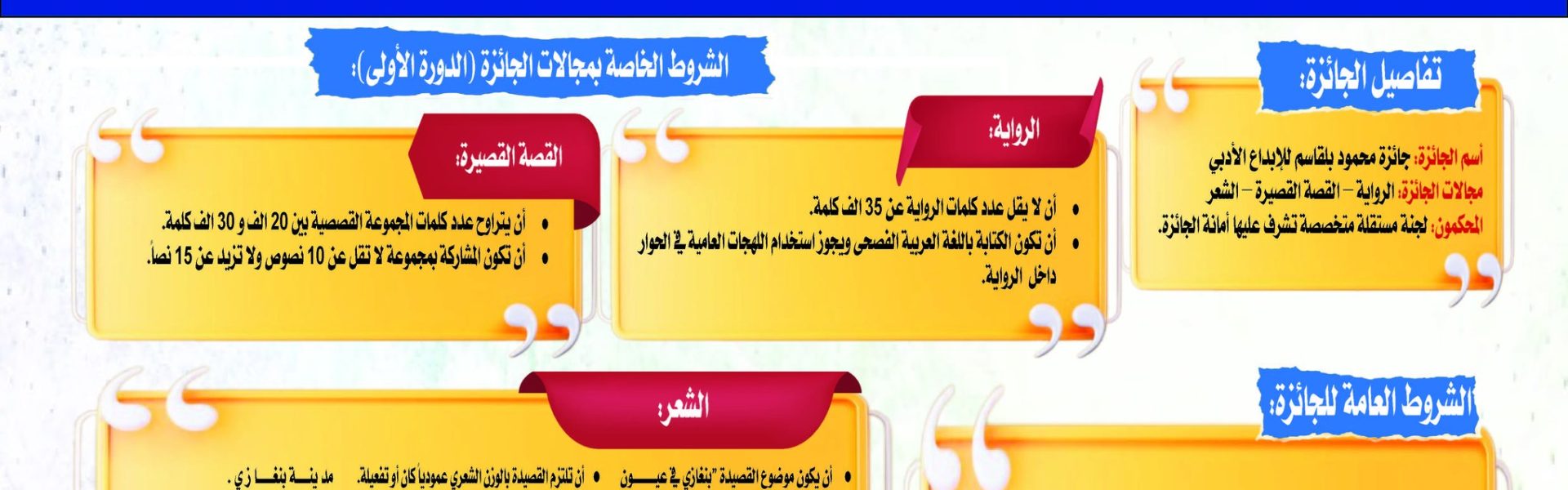 حدّد القائمون على الجائزة، شروطا خاصة للمشاركة في الدورة الأولى من هذه المسابقة، ففي الرواية يجب أن لا يقل عدد كلمات الرواية عن 35 ألف كلمة، وأن تكون الكتابة باللغة العربية الفصحى، كما يجوز استخدام اللهجات العامية في الحوار داخل الرواية، وبالنسبة القصة القصيرة، أن يتراوح عدد كلمات المجموعة القصصية بين 20 ألف و30 ألف كلمة، وأن تكون المشاركة بمجموعة لا تقل عن 10 نصوص ولا تزيد عن 15 نصاً، أما بالنسبة للشعر، فإن الشروط تتمثل في أن يكون موضوع القصيدة “بنغازي في عيون الشعراء”، وأن تكون القصيدة باللغة العربية الفصيحة، وأن تلتزم بالوزن الشعري عموديا كان أو تفعيلة، لإضافة إلى ذلك، أن تستلهم القصيدة القيم والجماليات والتاريخ والجغرافيا وعبقرية المكان وسيرة مدينة بنغازي، وألا تتجاوز الثلاثين بيتاً / سطراً شعرياً، فيما تكون المشاركة بنص شعري واحد فقط.
