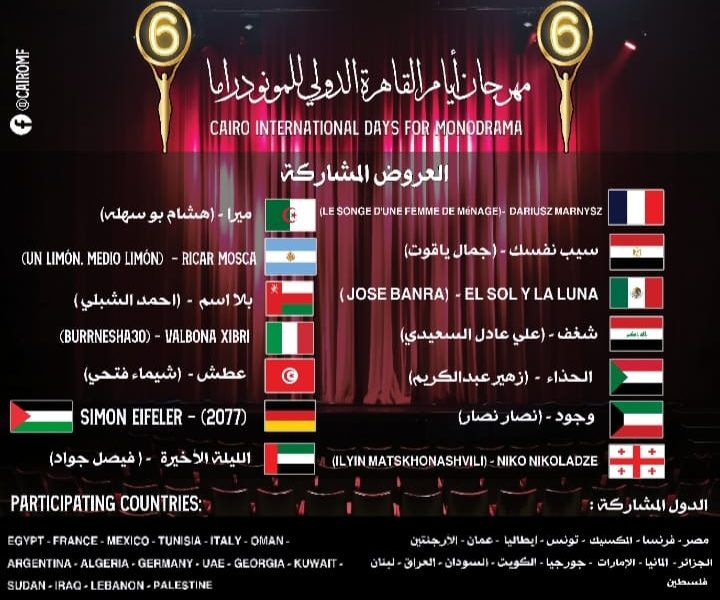 يشارك 14 عرضا مسرحيا في الدورة السادسة من مهرجان أيام القاهرة للمنودراما، والمقرّر تنظيمها في الفترة من 1 إلى 5 أكتوبر/تشرين الأول الداخل، تحت شعار “القاهرة عاصمة المنودراما”.
