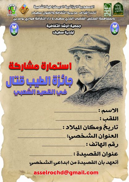 أعلنت جمعية الرشد الثقافية لبلدية سطيف عن تنظيم مسابقة في القصيد الشعبي للشعراء الجزائريين ولكل الأعمار، وقد خصّصت الجمعية لهذه المسابقة “جائزة الطيب قتال”، مبالغ مالية تتمثل في: