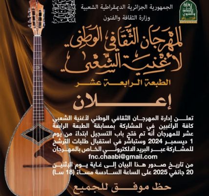 تجري النهائيات خلال الأيام الوطنية لأغنية الشعبي الطبعة التاسعة، بداية شهر ماي 2024 بدار الثقافة “هواري بومدين” بمدينة سطيف.
